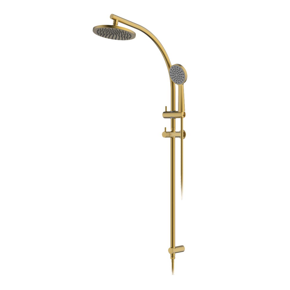 Features a functional rail and brass Shower Head.